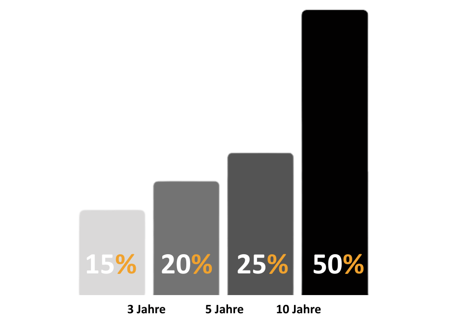 Wir belohnen Deinen Einsatz. Die betriebliche Altersvorsorge ermöglicht es Dir, bereits mit geringer Eigenleistung, eine attraktive Zusatzrente aufzubauen. Dein Sparbeitrag fließt steuer- und ggf. sozialversicherungsfrei direkt vom Bruttogehalt in den Versorgungsvertrag. Zusätzlich bekommst Du lukrative Arbeitgeber-Zuschüsse in Höhe von 15 % (ab dem 1. Monat Betriebszugehörigkeit), 20 % (ab dem 37. Monat), 25 % (ab dem 61. Monat) bis zu 50 % nach 10 Jahren. Das Gleiche gilt für die Berufsunfähigkeitsversicherung und auch für den Todesfallschutz.